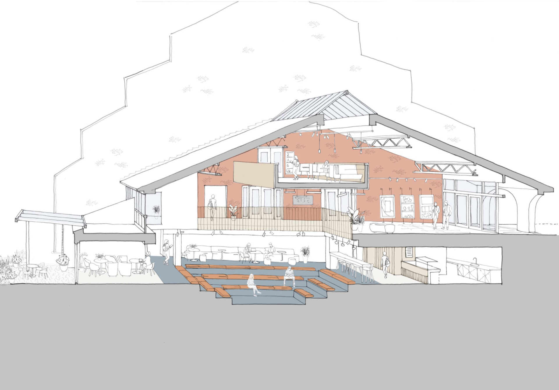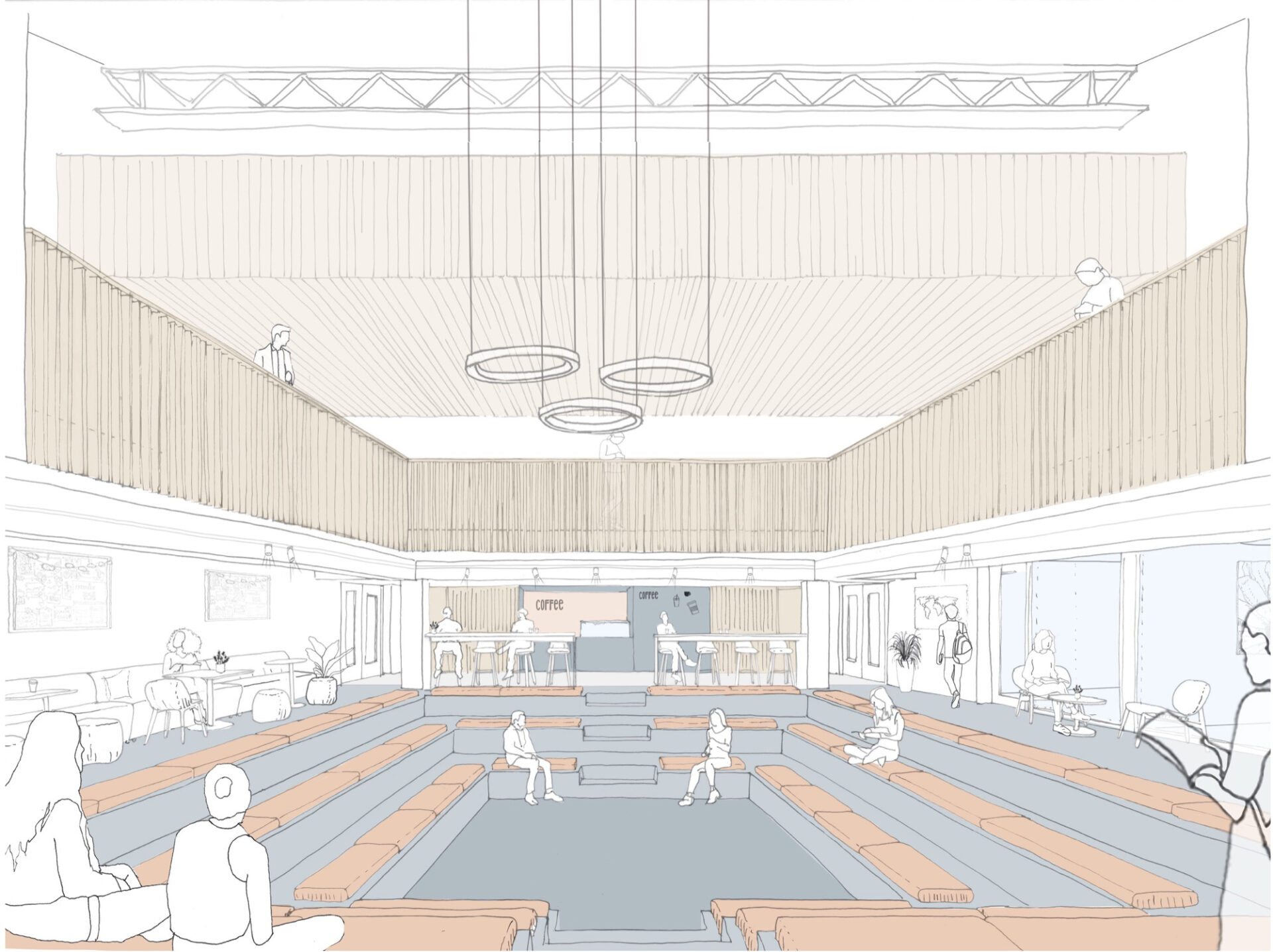 Though the space can host up to 200, the school wanted a grown up and informal atmosphere for everyday use, far removed from a lecture theatre. This is achieved through zoning that gives students choice in where they want to sit to meet different social and study needs. At the centre is amphitheatre seating for up to 124 people. Along the north and south walls, armchairs and work booths can be arranged for one-on-one conversations or individual work. A new garden room opens onto outdoor seating and provides views towards the woods behind.