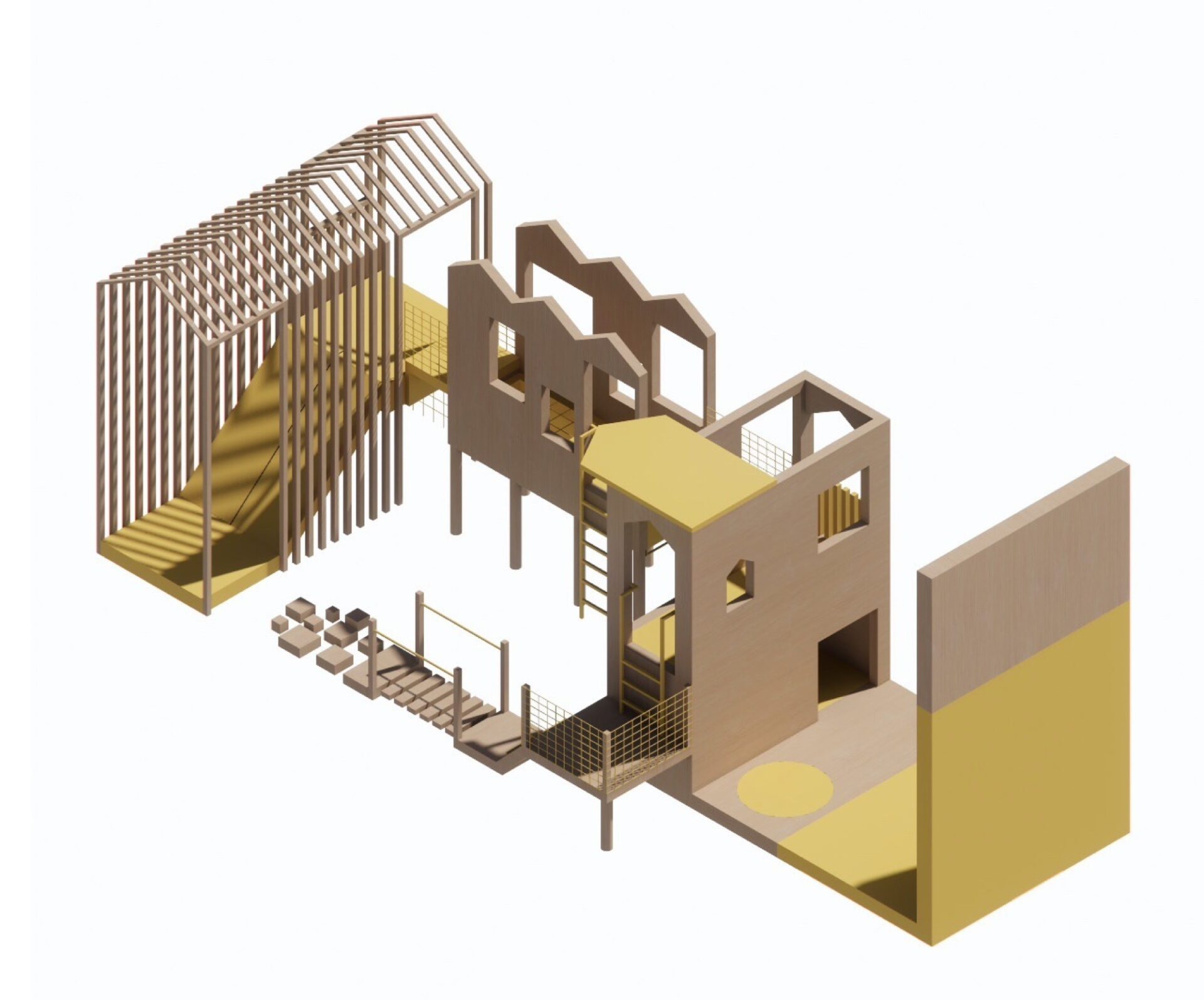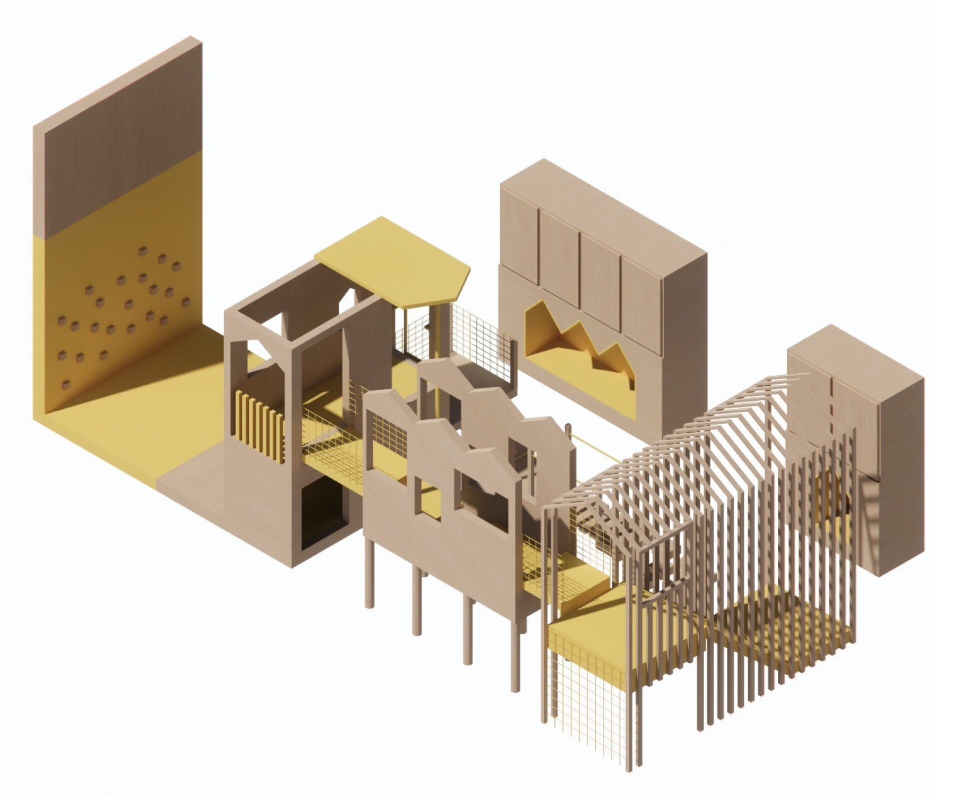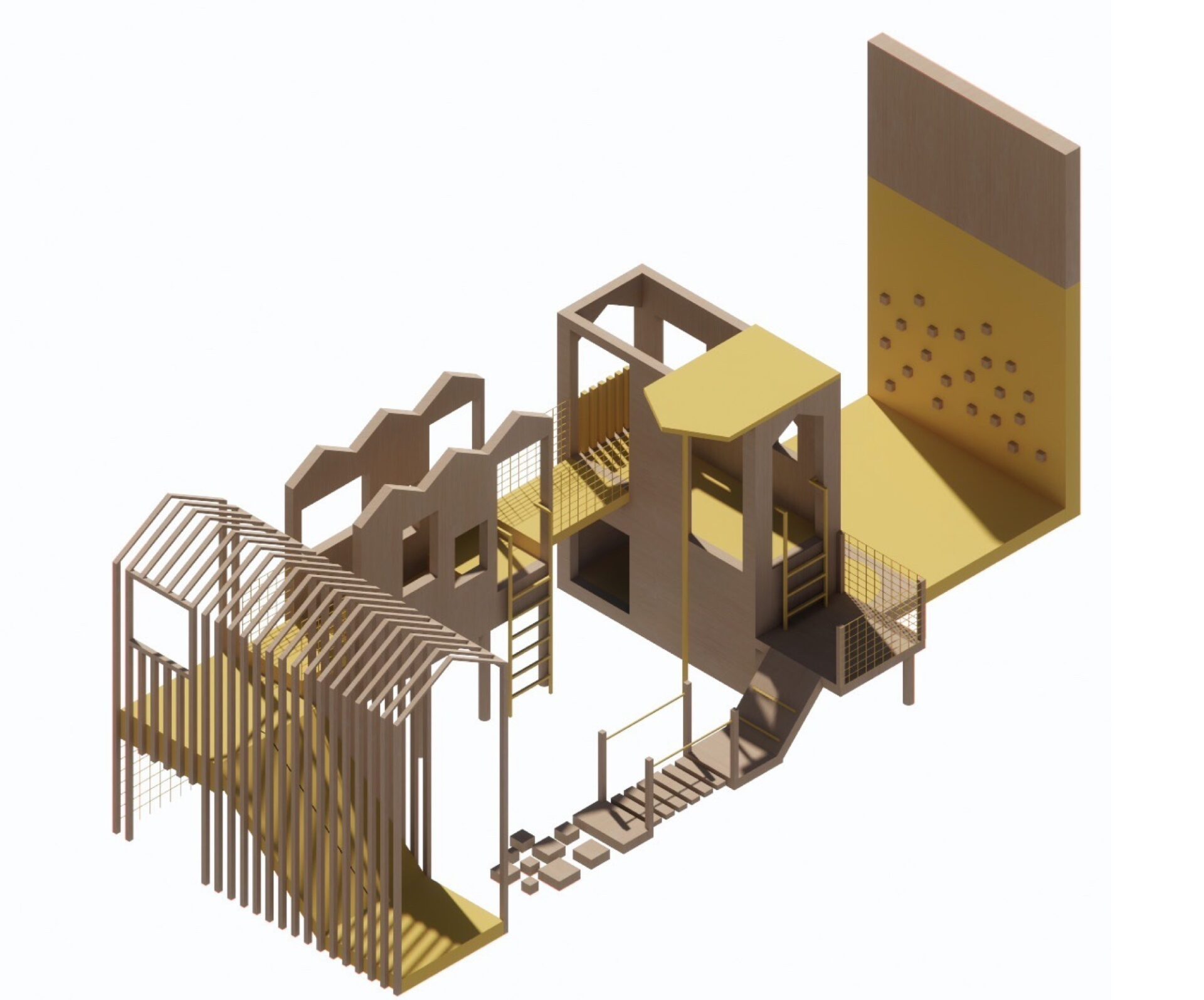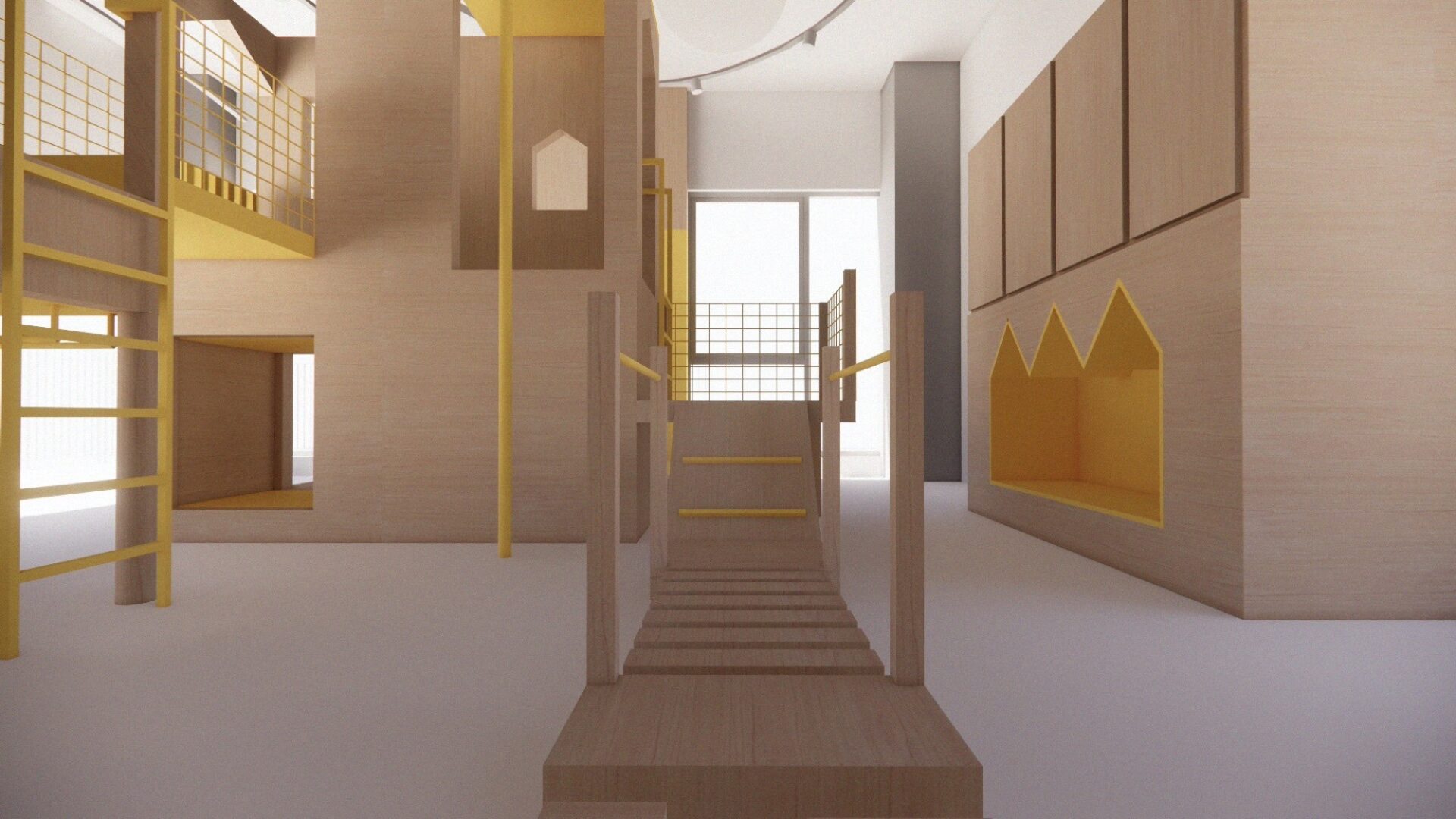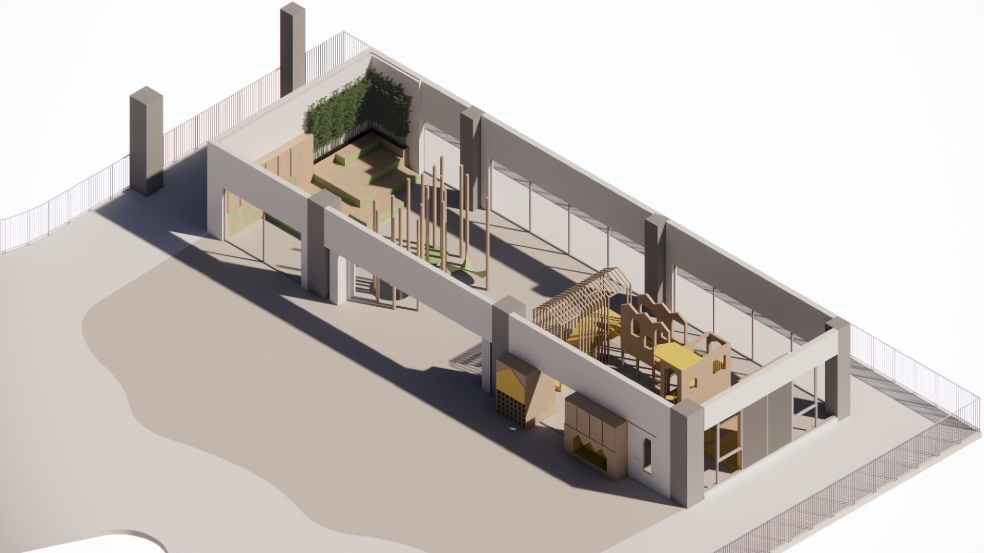 For energetic play and development of gross motor skills. It includes a climbing wall, nets, fireman’s pole and a trampoline. The yellow pop of colour is a nod to the original school's brand.