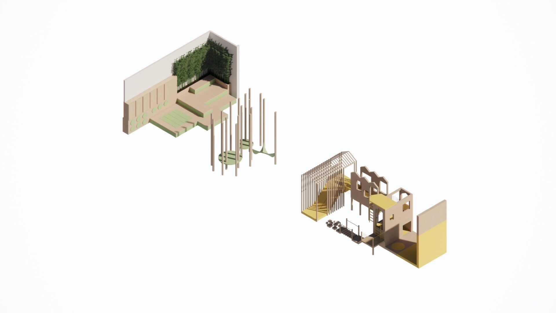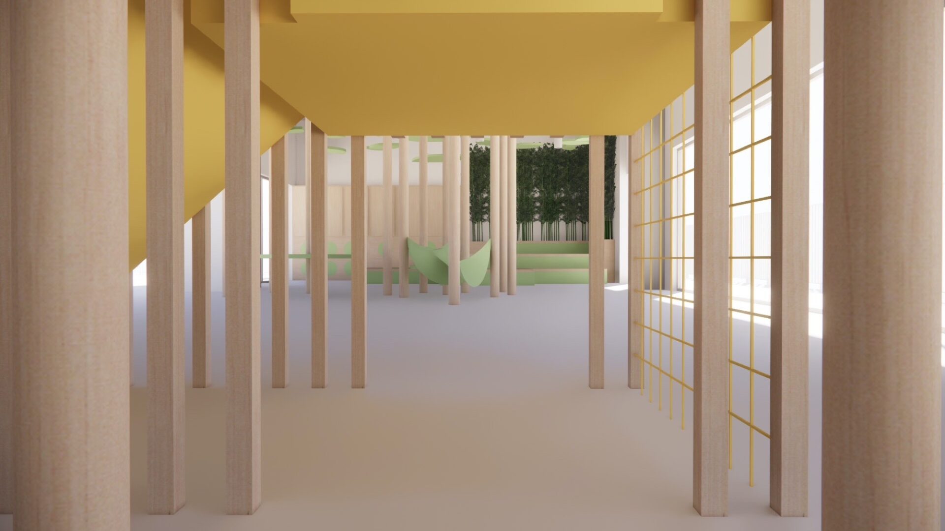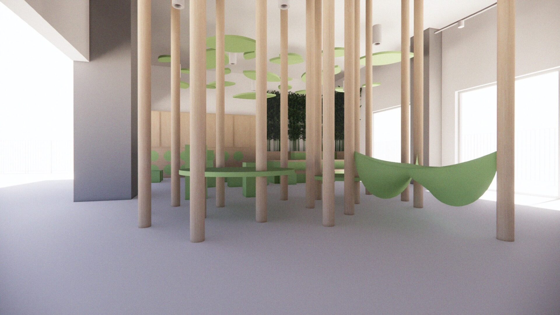 A bamboo forest with platforms and hammocks, where children can play games, make up stories and let their imaginations guide them.