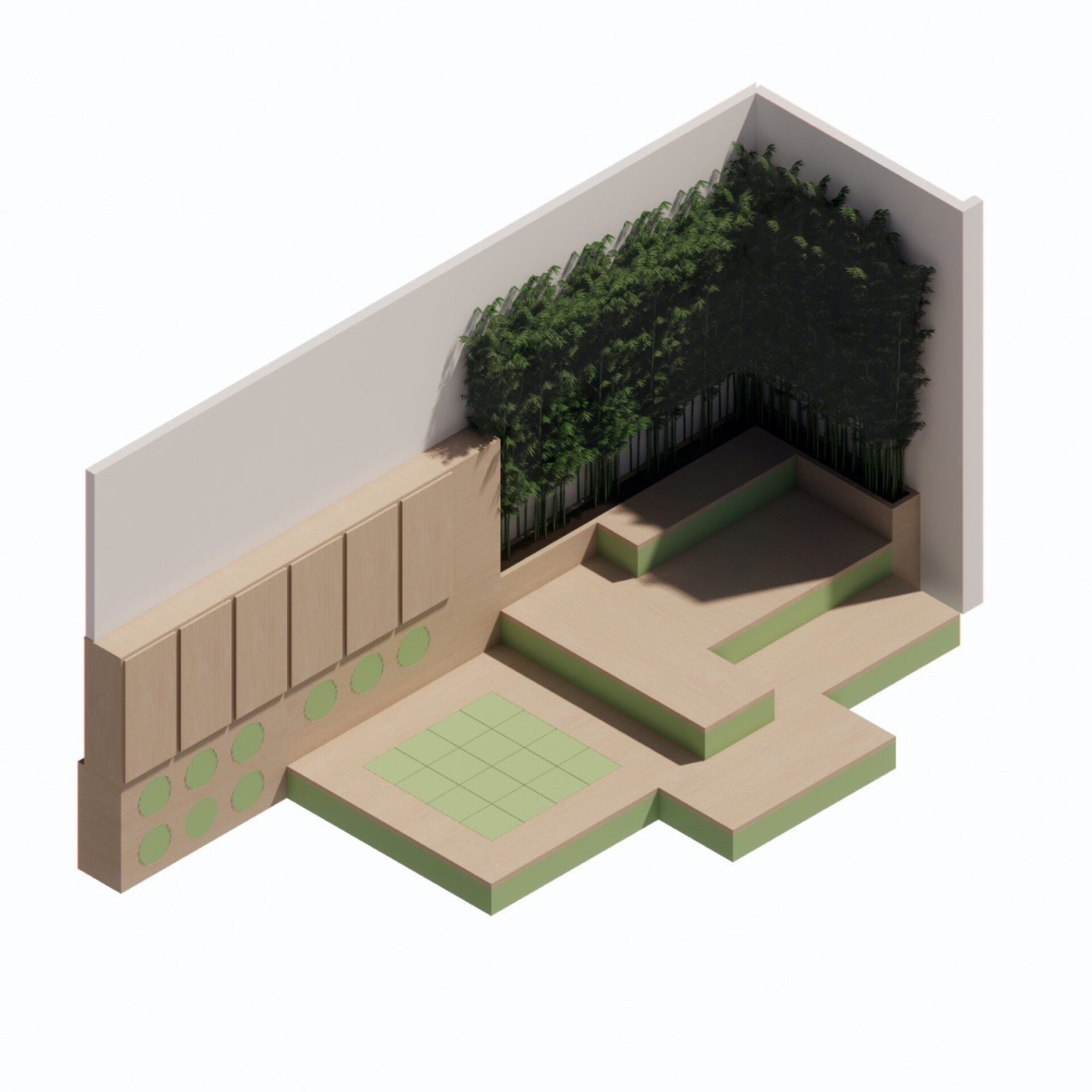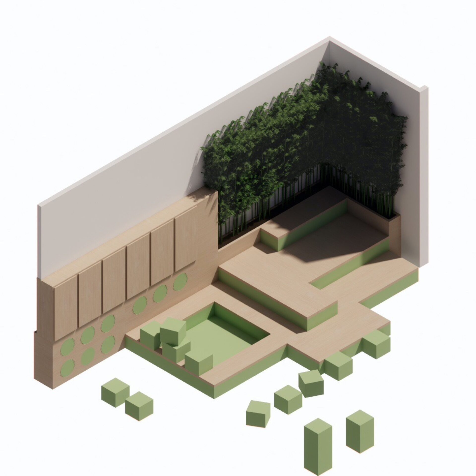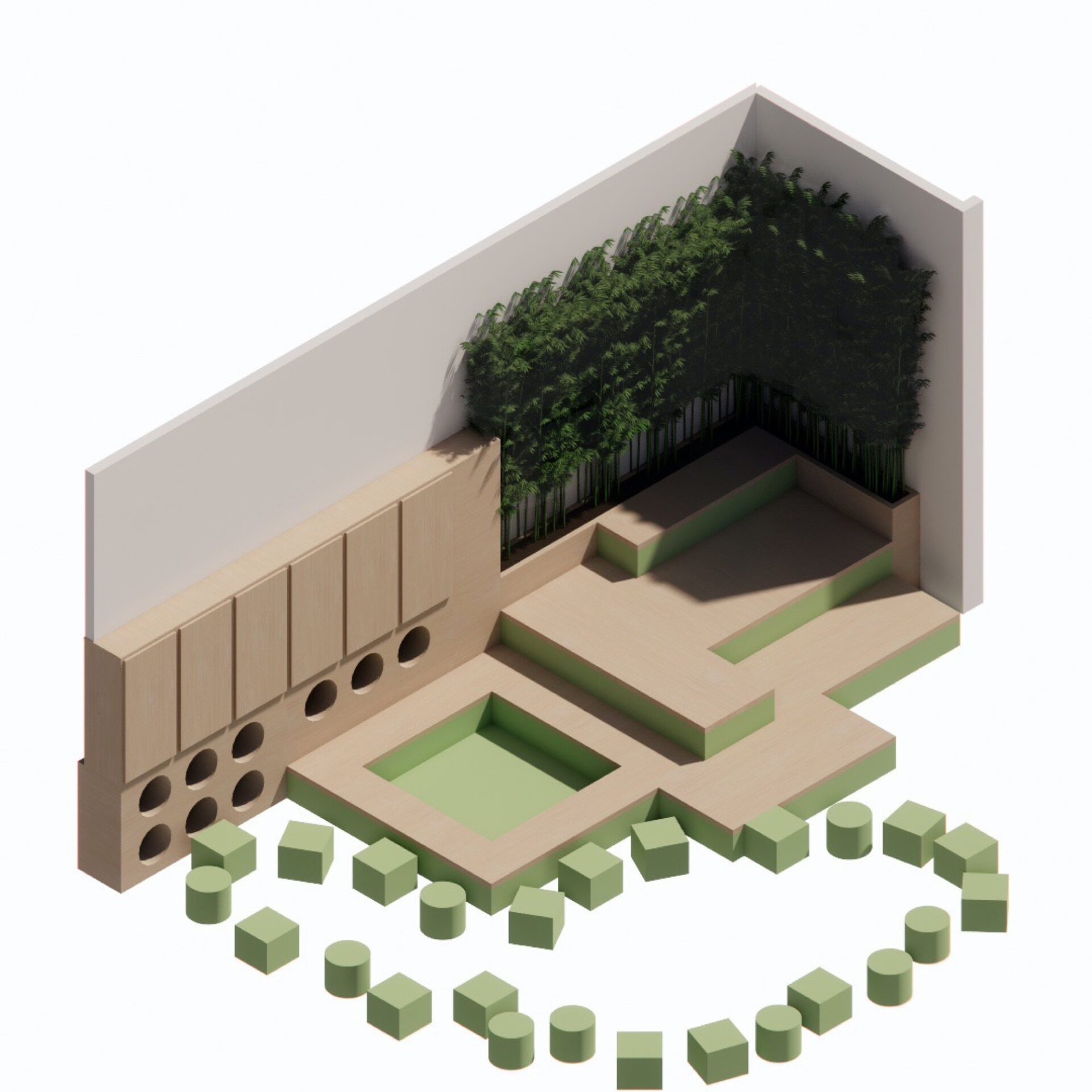 This area is for storytelling, quieter play and picnics, and doubles up as a teaching space. Amphitheatre steps can be used as a stage or for sitting with friends. An area of raised floor includes 16 blocks that can be taken out and used as building blocks or for seating. The storage wall features nine additional circular stools, with lockable storage for staff above. Planters here contribute to the calm and natural feel of this area.
