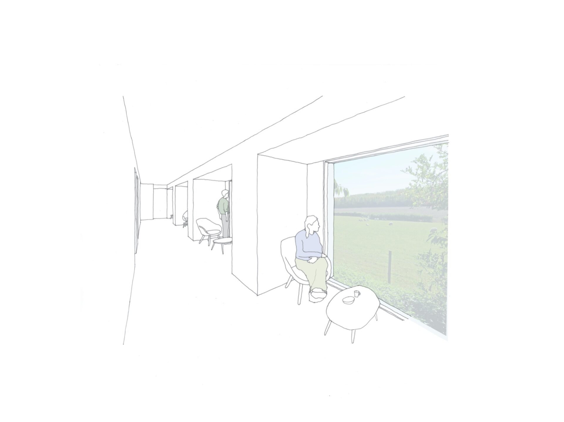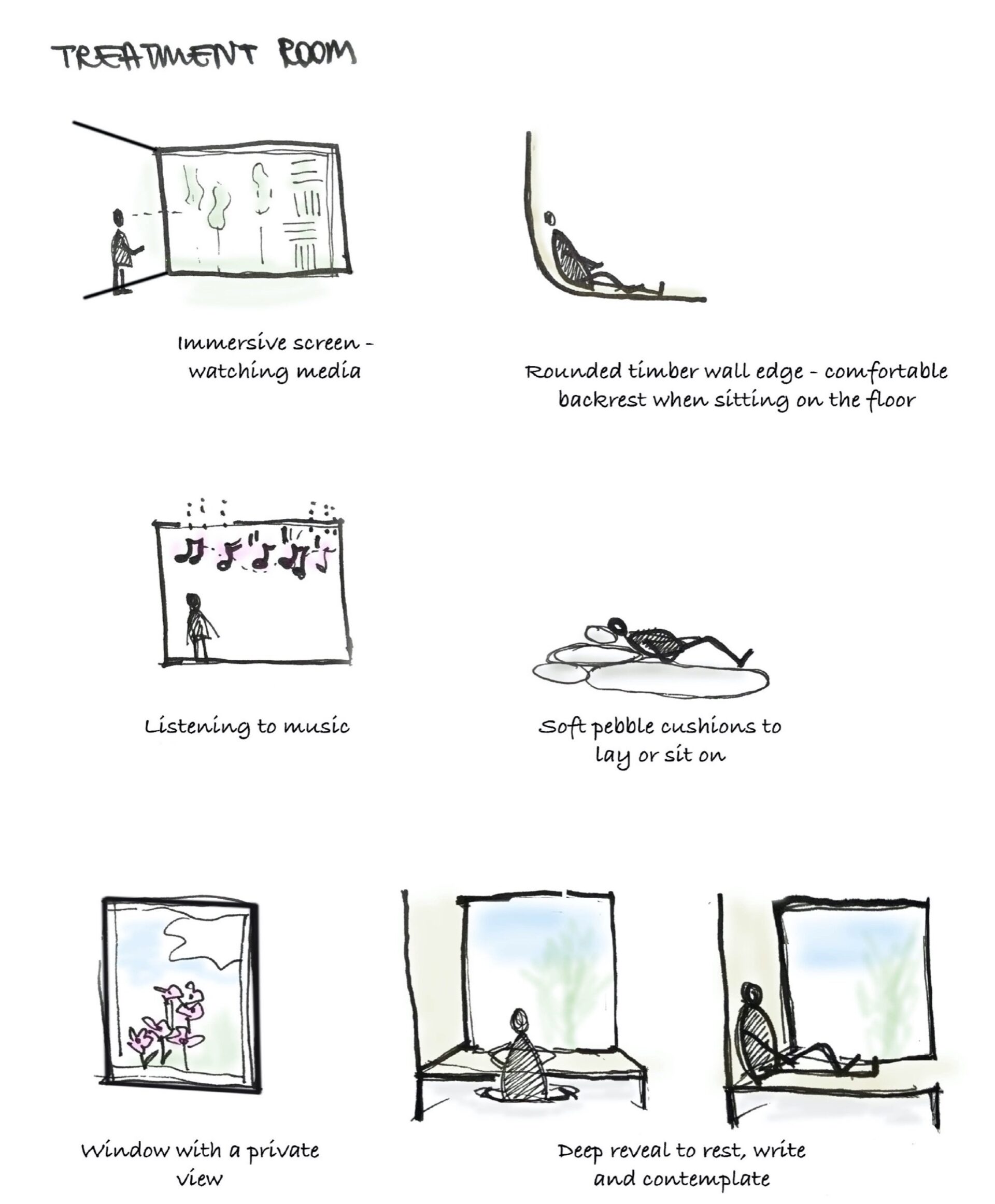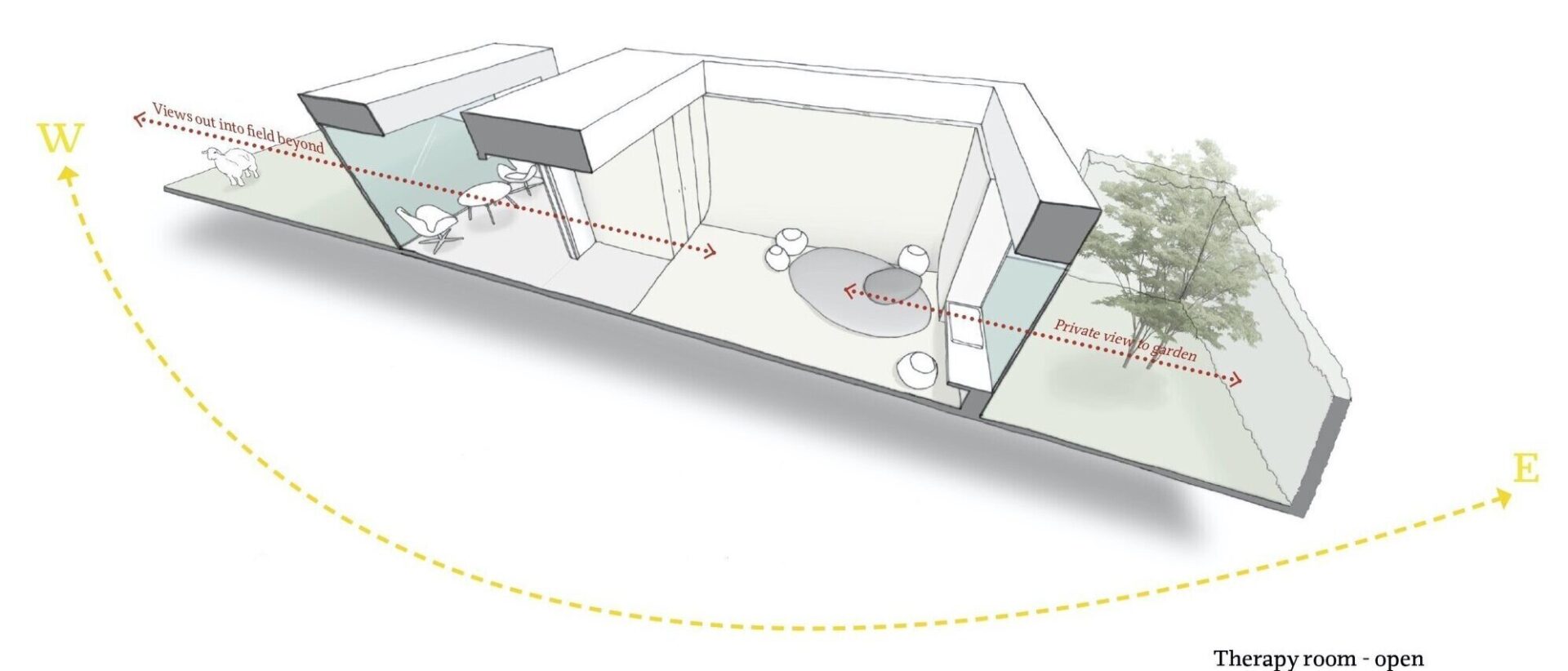The layout, materiality and privacy of the therapy rooms needed to be as comforting as possible, yet neutral so that patients weren’t distracted from their experience. Large screens could display images of nature if desired, and around the centre areas were for quiet reflection and companionship, with views out to the fields. Our aim was to create a clinic as far from an institutional feel as possible.